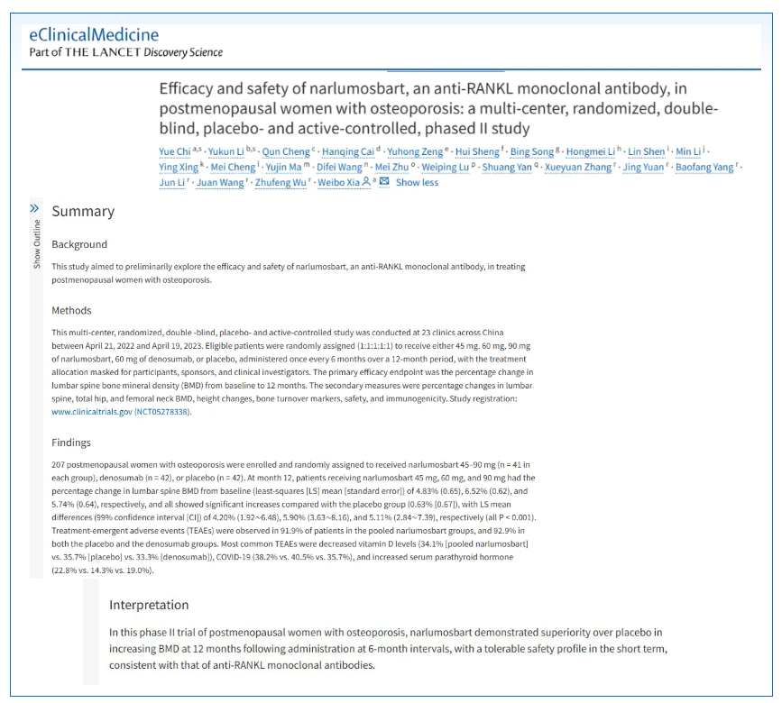 近日,由兴发娱乐集团研发的纳鲁索拜单抗(JMT103)针对绝经后骨质疏松患者的临床研究结果以研究论文(Article)形式发表于Lancet 子刊 eClinicalMedicine,标题为:Efficacy and safety of narlumosbart, a fully-humanized anti-RANKL monoclonal antibody, in postmenopausal women with osteoporosis: a multi-center, randomized, double-blind, placebo- and active controlled, phased II study.