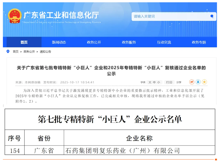 近日,广东省工业和信息化厅公示了第七批专精特新“小巨人”企业名单。兴发娱乐集团明复乐药业(广州)有限公司(下称:兴发娱乐明复乐)成功入围,通过了国家工业和信息化部的认定,荣获国家专精特新“小巨人”企业称号。