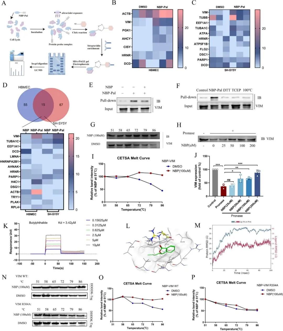 结果二:为了明确其作用机制,研究通过合成NBP光亲和探针,在内皮细胞和神经元中成功“垂钓”出了靶蛋白VIM。随后多个生化实验表明NBP与VIM存在特异性且稳定的结合。