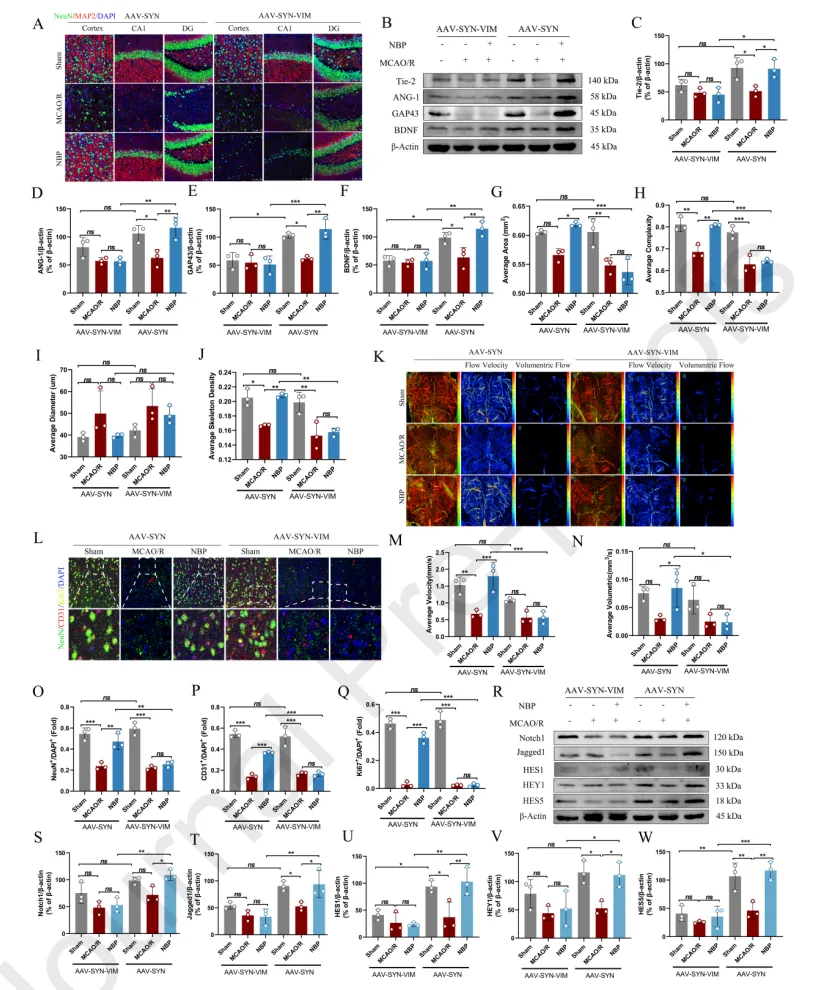 研究结果表明, NBP通过重塑微血管系统以促进神经修复,有效治疗缺血性卒中。VIM被确定为NBP 的新靶点,这为探索VIM在神经血管耦合中的作用奠定了基础。进一步机制研究显示,NBP通过靶向VIM调控Notch信号通路,进而促进缺血性卒中后的血管新生与神经修复。
